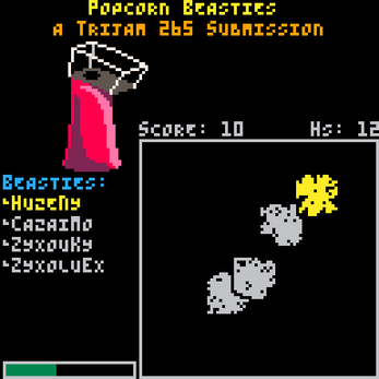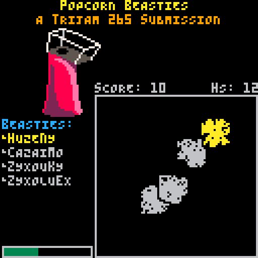 Popcorn Beasties is a button masher game. Try to mash the button to keep beasties in the room. Beastie sprites and names are procgened, so don't expect to play the same game twice!